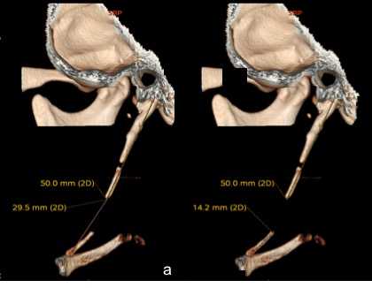 La medición del CEH se realizó desde la base de la apófisis hasta la última porción osificada detectable en la imagen. Las partes no osificadas fueron incluidas en dicha longitud, de manera que el CEH del lado derecho midió 79,5 mm (Figura 2) y el izquierdo 82,6 mm (Figura 3).
