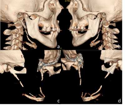 A la exploración de las imágenes tomográficas se observó que ambas apófisis estiloides, estaban alongadas, por lo que se procedió a su evaluación en las reconstrucciones volumétricas en 3D (Figuras 1a,b). Para medir la longitud del CEH se suprimieron las estructuras anatómicas anteriores, posteriores, laterales y mediales, hasta obtener una vista completa del mismo. El CEH del lado derecho presentó una osificación tipo III de acuerdo a Langlais et al. 4 (Figura 1c), mientras que el del lado izquierdo una Tipo II (Figuras 1d).
